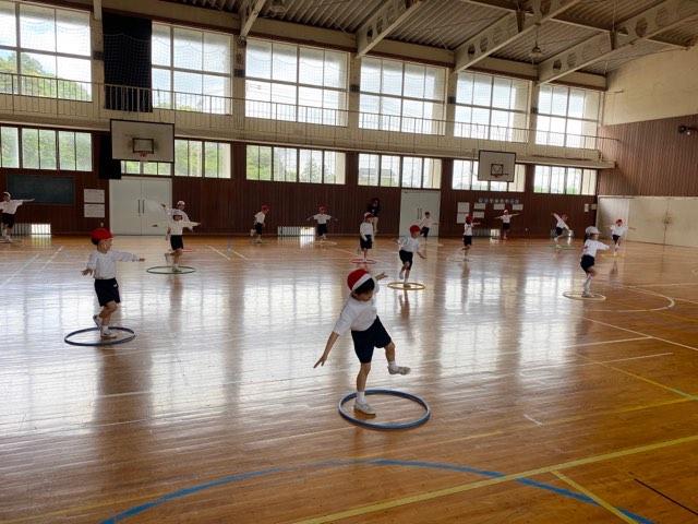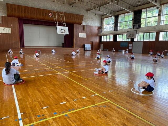 1年生はフラフープを使って間隔をとり、体を動かしました!バランス運動や柔軟運動等、たくさん汗をかきました。ステイホームで思い切り体を動かすことができなかった子どもたちでしたが、スッキリした気持ちになっていました。