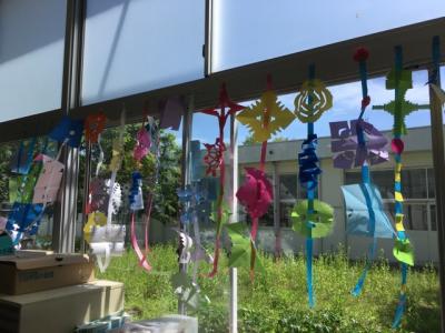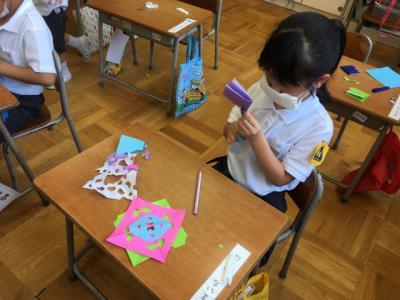 図工の時間、ハサミを使って飾り作りをしました。保育所や幼稚園での経験もあり、折り紙の折り方、ハサミの使い方など、自信を持って教えてくれました。