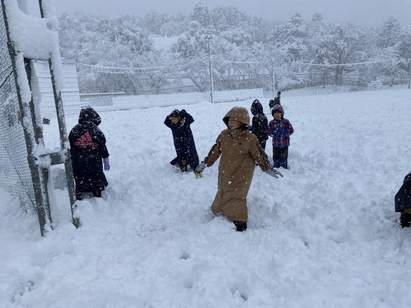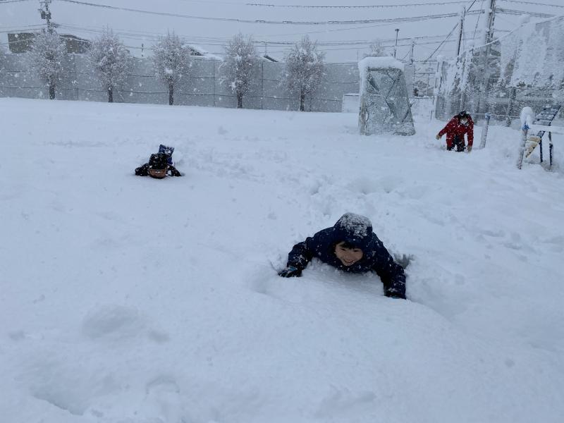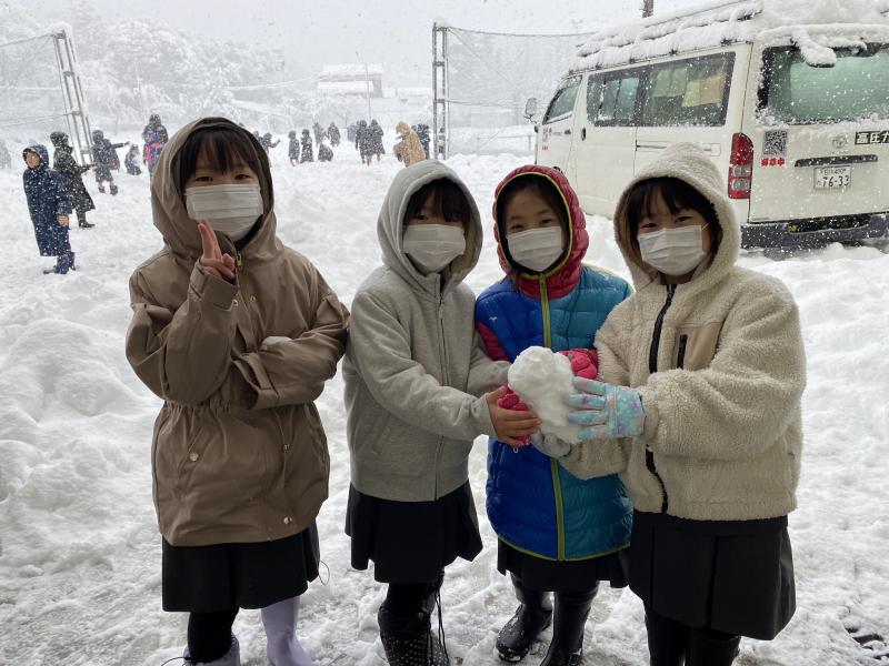 鳳至小学校の運動場は、たくさんの雪が積もっています。2年生の子どもたちは、寒さに負けず、最終日の長休みも昼休みも雪遊びをしていました!