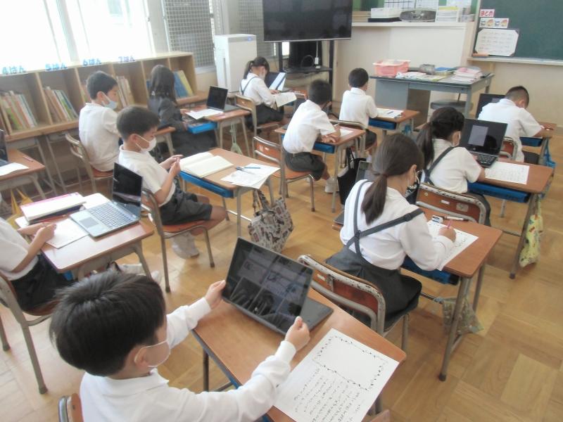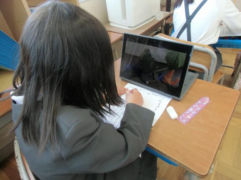 以前撮った野菜の写真に、日付と一言を書いている様子です。chromebookを使うと、普段書けないようなところに、文字を書くことができるで、子どもたちは「なんて書こうかな・・・」と考えながら取り組んでしました!