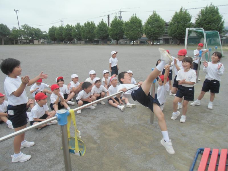 2021年6月16日 19時34分昨日の体育では、鉄棒で逆上がりの練習を行いました。逆上がりが成功するように、みんなで応援している様子です。