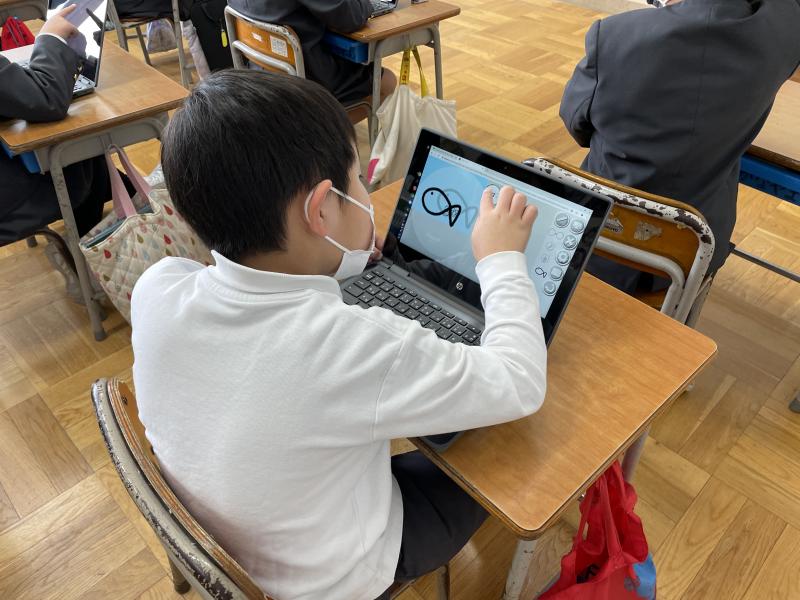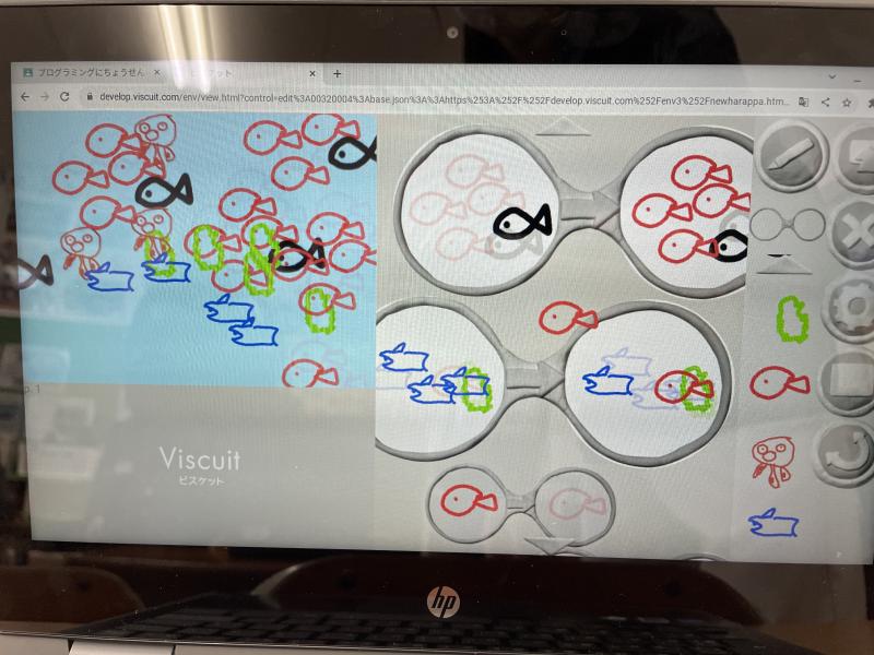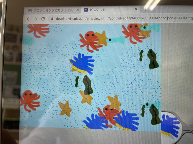 図工の授業では、ビスケットというアプリを使って、プログラミングの学習を行いました。ビスケットでは、自分の描いた絵を自由に動かすことができるという機能があります!