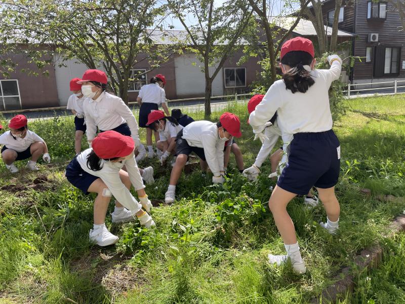 2022年5月13日 16時26分先日、生活科の時間に畑の掃除をしました。しばらく使っていなかったので、草がたくさん生えていました。しかし、逆に子どもたちのやる気に繋がったのか、みんなで協力しながら楽しそうに掃除をしていました!