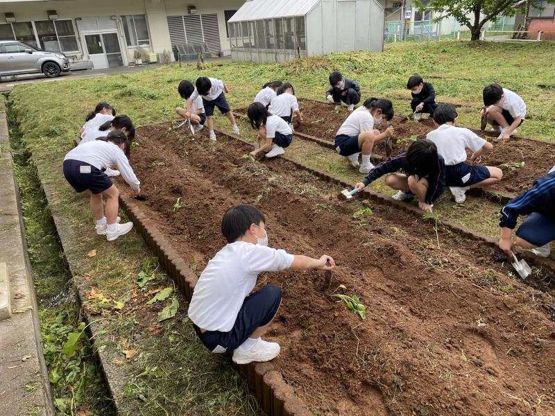 先日、生活科の時間に畑の掃除をしました。しばらく使っていなかったので、草がたくさん生えていました。しかし、逆に子どもたちのやる気に繋がったのか、みんなで協力しながら楽しそうに掃除をしていました!
