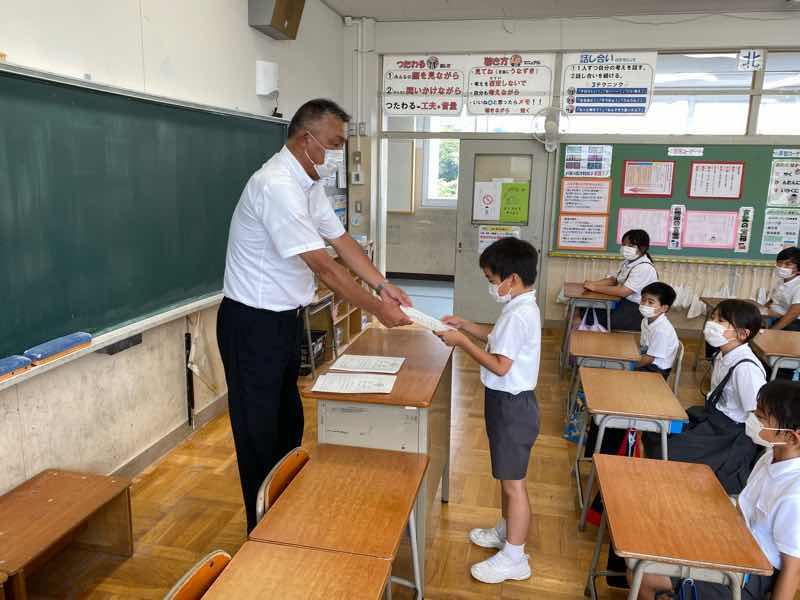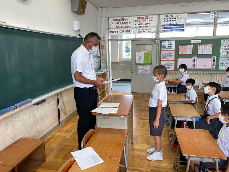 今日は、3年教室に校長先生が全校テストの表彰に来てくださいました。