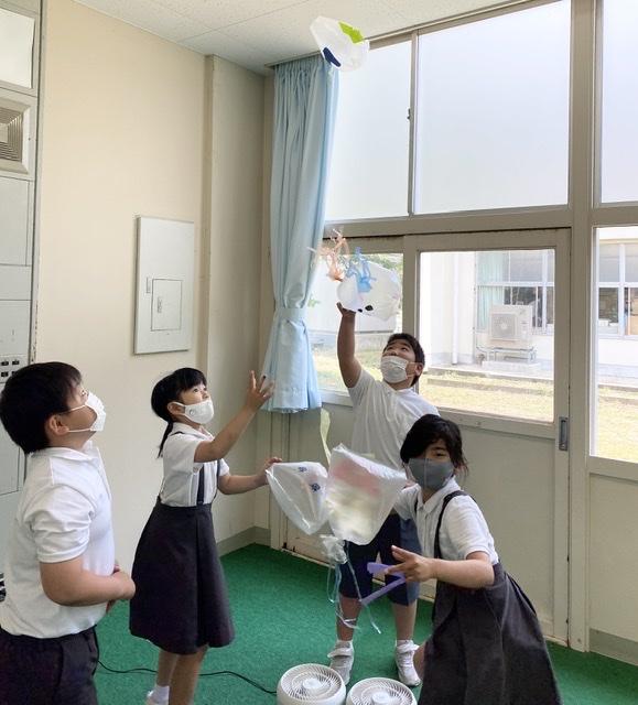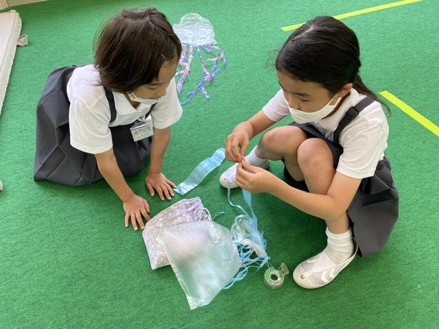図画工作科では、風にのって吹き上がるものを袋を使って作りました。飾りをつける時は、友だちと協力し合ったり、アドバイスをし合ったりして、素敵に仕上げていました!