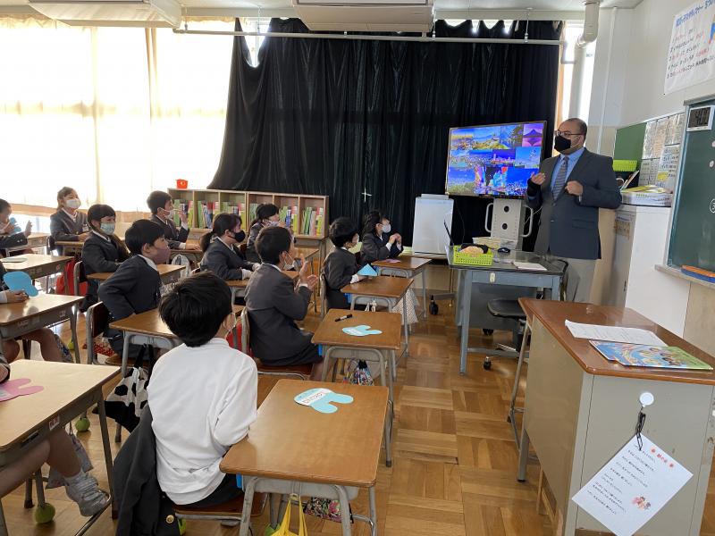 3年生から外国語活動の学習が始まります。初回の昨日は、ライアン先生の自己紹介を聞きました。どんな事を言っているのか考えながら、スライドを見て、よく聞くことができました!