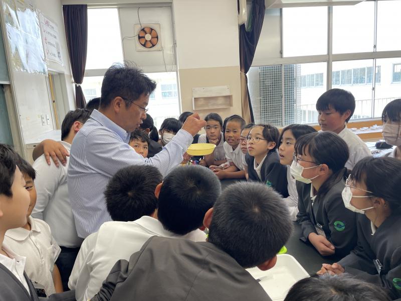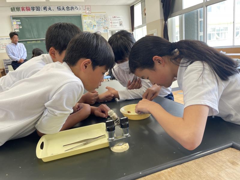 理科の授業の様子です。先日の授業では、いんげん豆の種子の中には何があるのかを調べました。子どもたちは、教頭先生からの実験の説明に興味津々!早く知りたい、やってみたいという気持ちが表情から伝わってきました!