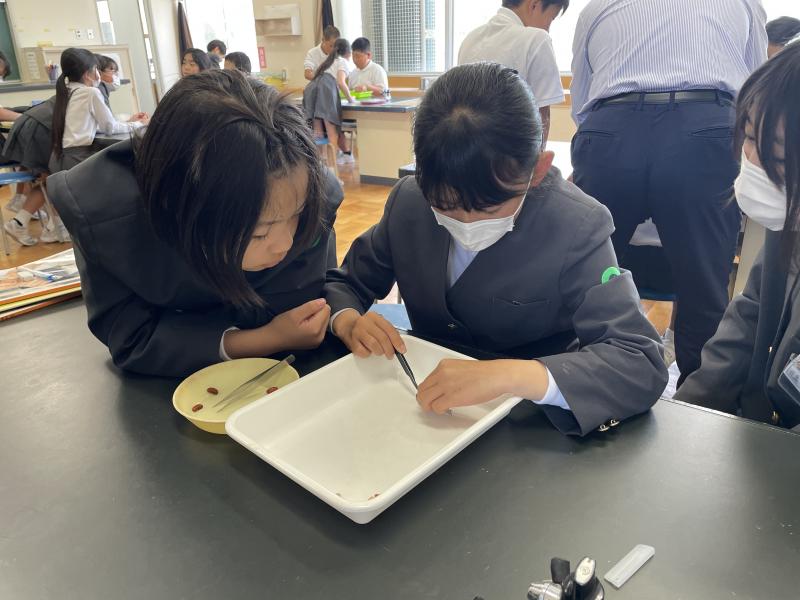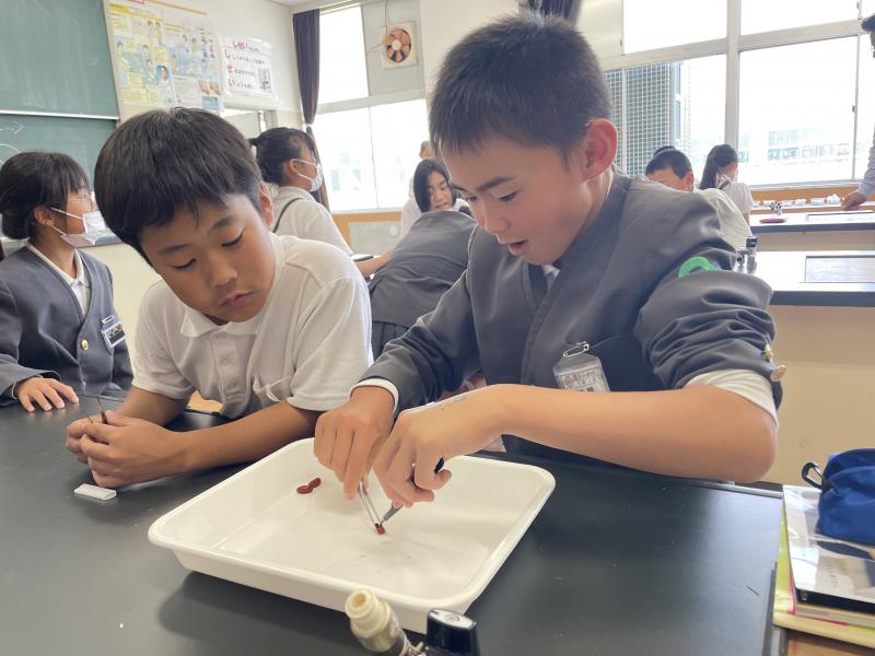 実験では、カッターナイフを使ってえんどう豆の種子を切り、観察しました。友だちの様子を見つめていたり、結果をノートにスケッチしたりと、意欲的に学ぶ姿が見られました!