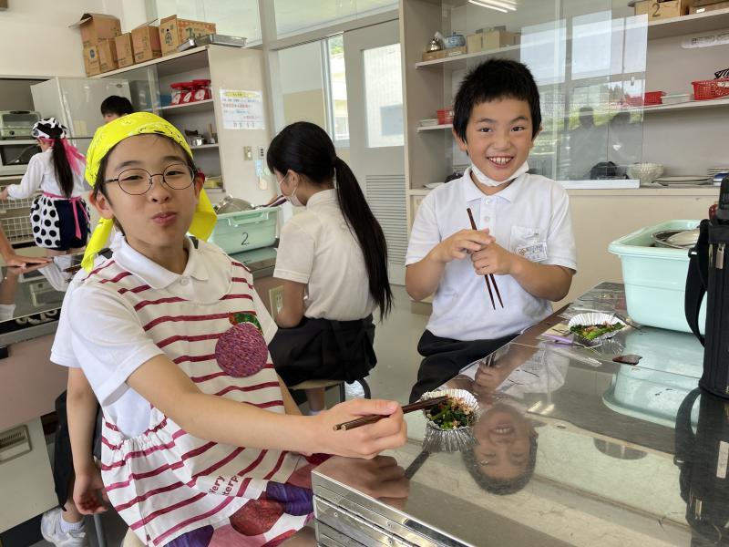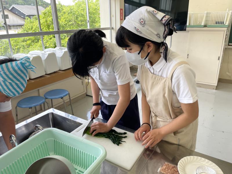 今日から家庭科で調理実習を行いました。先週の「こふきいも」に続き、今回は「ほうれん草のお浸し」でした。大切なポイントを押さえ、グループのみんなで協力しながら作っていました!最後はおいしそうに食べていました♪