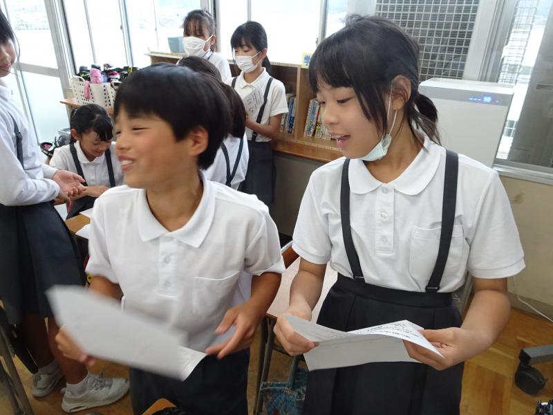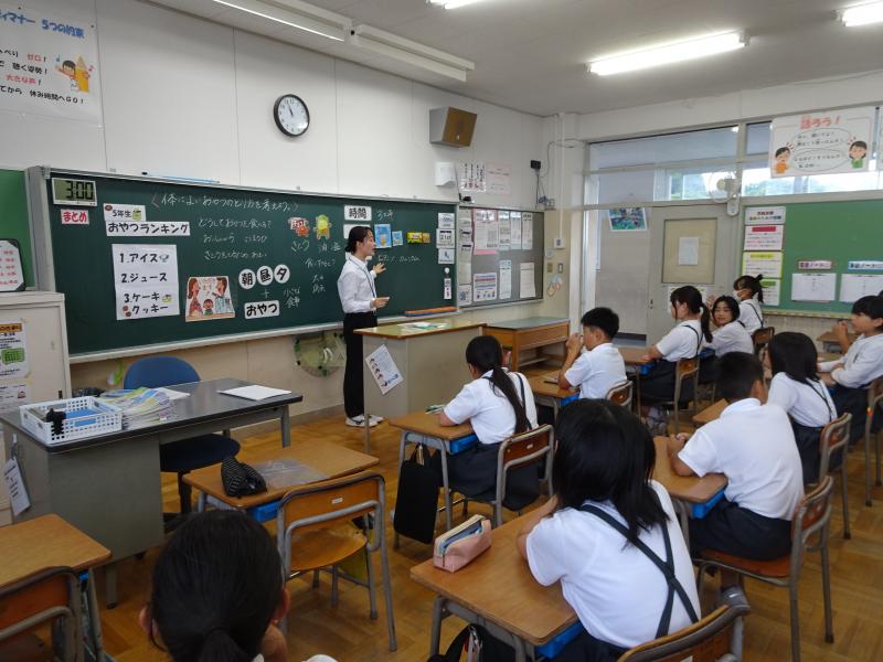 今日の学活では、栄養教諭の先生と教育実習生の先生が「おやつの役割」についての授業をしてくださいました。おやつは、食事だけでは足りない、自分が成長していくための栄養素を補う役割があるということを知った子どもたち。体の良いおやつの取り方について楽しく学んでいました!