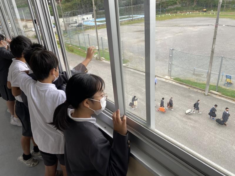 今朝、6年生が宿泊体験学習に向かいました。玄関から「行ってきます!」の声が聞こえると、お見送りをするために子どもたちは廊下にかけ出しました。3階から6年生の姿を眺める子どもたちから、「行ってらっしゃい!」と言う声と共に、「来年は俺たちの番や」と話す声も聞こえてきました。