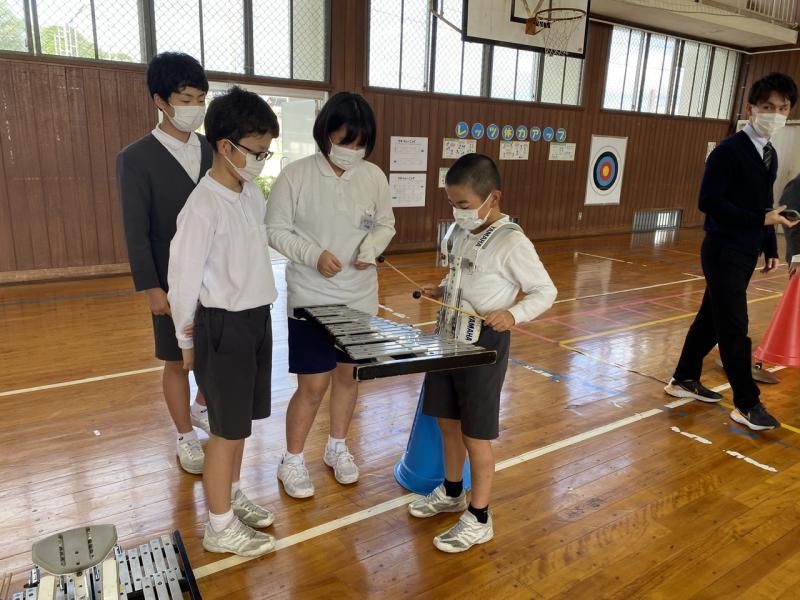 本日、後期の金管鼓隊始動の一歩として、担当するパートを決めるために6年生に楽器紹介をしてもらい、体験してみました!