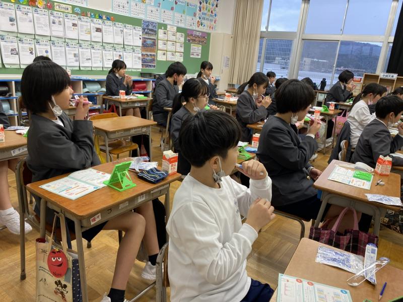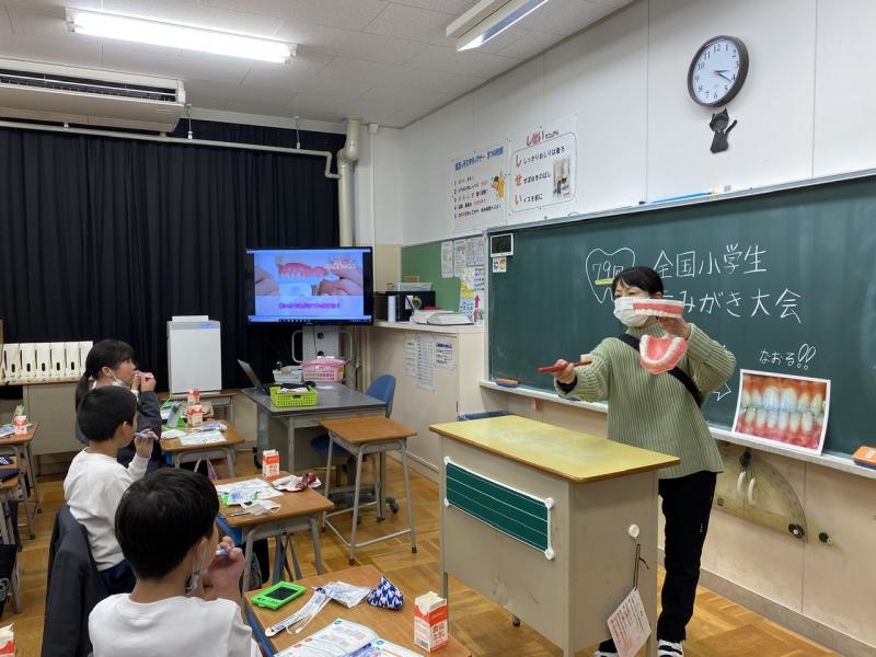 学活の時間に、歯磨き大会に参加しました。毎日、歯磨きをしていますが、「歯磨きをやりきることはできていますか?」という質問には自信がなさそうな子どもたち。歯肉炎を防ぐ正しい歯磨きの仕方を学習しました!また、歯磨きでは落としきることが出来ない歯と歯のすき間の汚れは、デンタルフロスを使ってキレイにすることが大切だということも学びました!