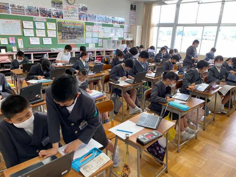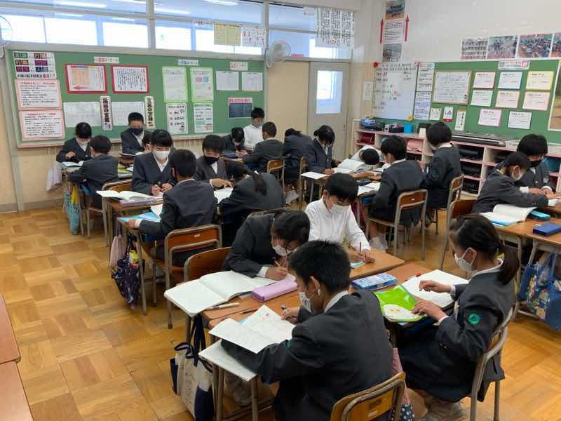 この写真は、何をしている様子でしょうか?これは、子ども達の自主学習力を高めるために、お互いの宿題の取り組み状況をチェックし、評価したりアドバイスし合ったりしている様子です。月末には毎月この時間を確保し、自分達の未来を切り開いていくための、自主学習力UPに取り組んでいきます。
