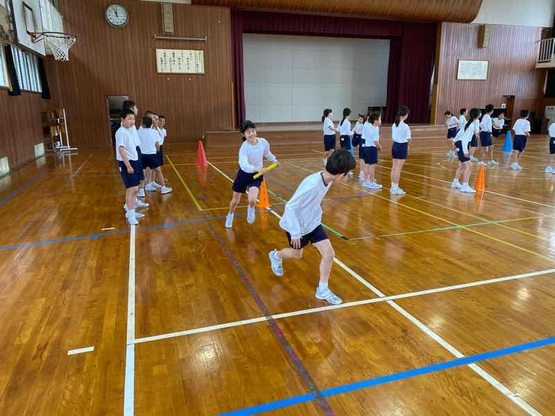 今日の体育では、4つのチームに分かれてリレーをしました。各チームでタイムをとり、どうすればタイムを縮められるか話し合ったり、練習したりしました。今日は肌寒いですが、これでもかというくらい走ったので、汗だくでした。