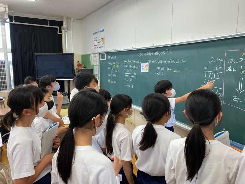 今日の算数では「小数のかけ算の筆算が成立する仕組み」について考えました。「あ‼︎わかった‼︎」という子に対して、「どういうこと?説明してよ‼︎授業して‼︎」という子ども達。
