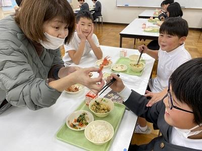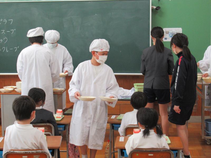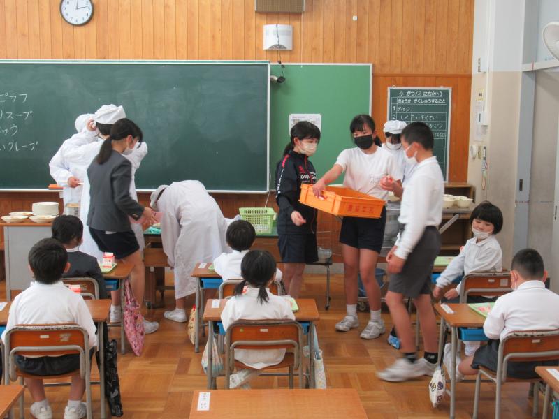 1年生の給食当番をする6年生
