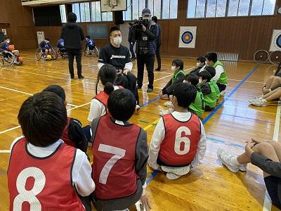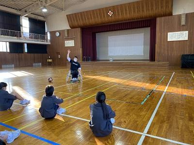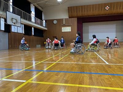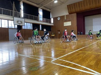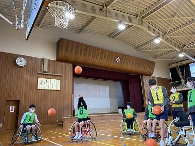講義の後、体育館で競技用の車いすに実際に乗ってみて、シュート練習を行ったりバスケットの試合をしたりしました。「もっと障がい者スポーツについて調べてみたくなった」「今日の体験を通して、しょう害は身近なものだと感じた」と子どもたちは振り返っていました。