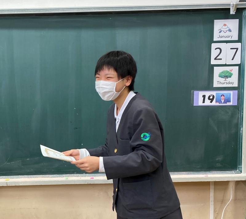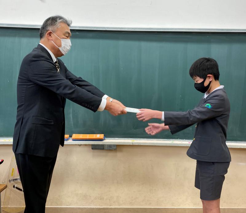 大人数で集まることが難しい状況になっているので、校長先生が教室を周り、校内書き初め大会の出張表彰式を行いました。今年は、8人が金賞に選ばれました。おめでとうございます!!