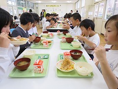 ランチルームで、1年2組と5年1組が合同でいただきました。