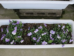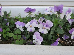 プランターのパンジーは、春の日差しを浴びて綺麗に咲いています。