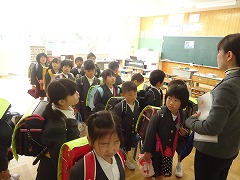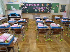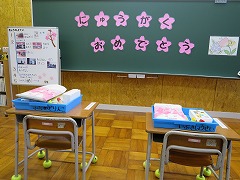 入学式後、1年生は各クラスでランドセルカバー贈呈式を行いました。