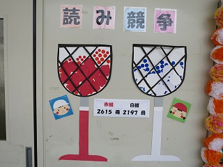 一年間を通して赤(1組)白(2組)に分かれて図書室の本を借りた冊数を争っています。