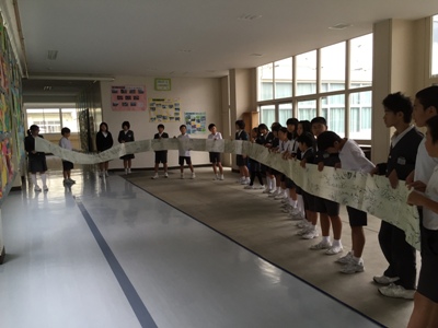 「『鳥獣戯画』を読む」の学習にあたり,日本最古の漫画と言われる絵巻物『鳥獣戯画』を原寸大に再現してみました。伸ばしても伸ばしても終わらなくてとうとうクラス全員で持つことに。