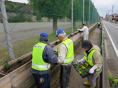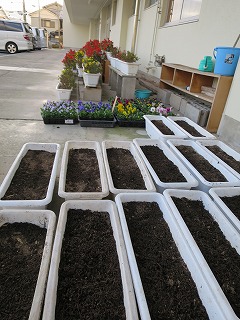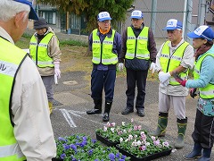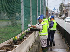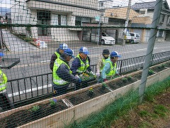 地域ボランティアの方々、見守り隊の方々が、運動場横の花壇に