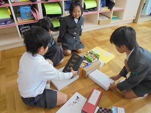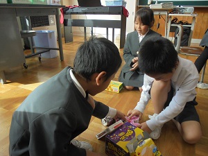 1年生は、算数の時間に、家からもってきたたくさんの箱を使って、