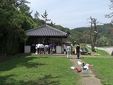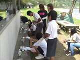学校前から、袖ヶ浜まで親子で歩き、キャンプ場で空き缶を使ったご飯炊きです。