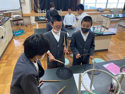 小太鼓パートでは、6年生がスティックの持ち方や演奏する姿勢、オーディション課題曲のドラママーチの手本を見せてくれました。