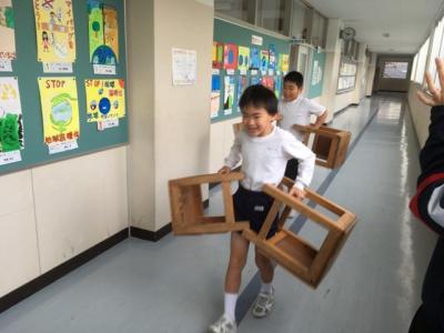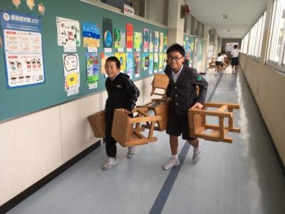 朝、その時に使う椅子を図工室から運ぶことに。約30個と数も多く、放送でお手伝いを募りました。