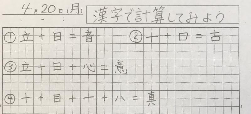 ちなみに、始めは2つの漢字での計算しか思いつきませんでしたが、本で探しながら取り組んでみると、最大4つの漢字を組み合わせて一つの漢字ができる計算を思いつきました。