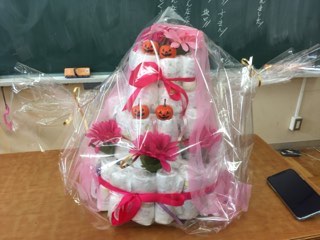 みんなで色紙にメッセージを書き、おむつケーキを作りました。