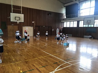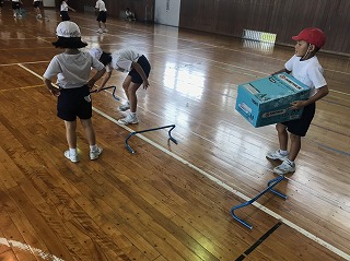 今日は障害物リレーの、「障害物」を工夫して並べました。