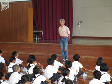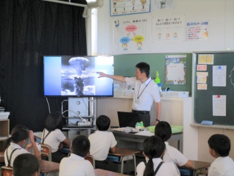 子どもたちは真剣に聞いてくれました。被害の様子の写真もみんなで見ました。