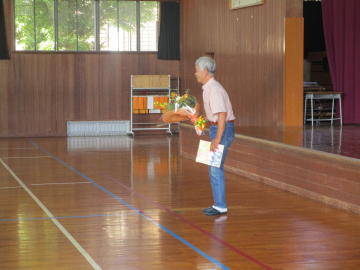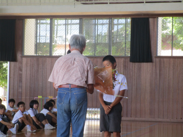 2019年8月14日 12時37分 8月8日(木)は全校登校日でした。長年、子どもたちの登校の様子を見守ってくださった田中さんが、体の都合により7月でやめることになりました。感謝の気持ちをこめて児童代表が花束と色紙をプレゼントしました。本当にありがとうございました。