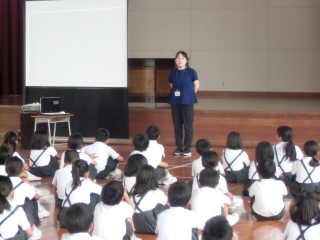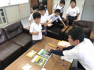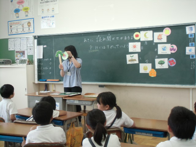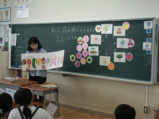 2019年7月20日 13時31分 本校では「英語教育強化拠点地域事業」に取り組んでいます。その一環として英語の絵本の読み聞かせをしています。写真は「はらぺこあおむし」のお話の読み聞かせの場面です。