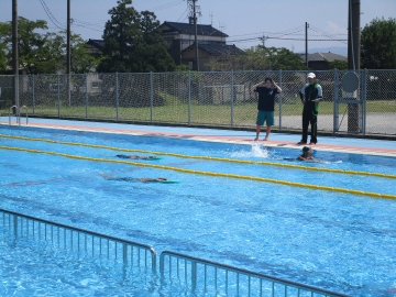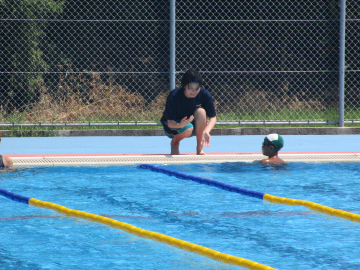 2019年8月6日 13時32分 水泳大会の練習です。今日は高校生のゲストティーチャーを招いて指導をお願いしました。的確なアドバイスのおかけで上達する姿が見られました。暑い中ありがとうございました。
