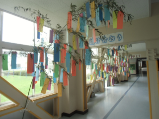 2019年7月4日 11時15分 児童玄関に七夕かざりが飾られました。代表委員会が考えた企画です。