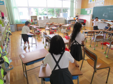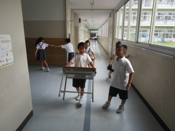 2019年6月11日 08時32分 エアコン工事のために仮の教室で勉強してましたが、6月10日(月)に元の教室に戻りました。写真は1年生が机を運んでいる様子です。大きな机をもって運ぶ姿に2ヶ月半の成長が見られます。