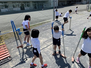 今日の昼休みも竹馬をしました!
