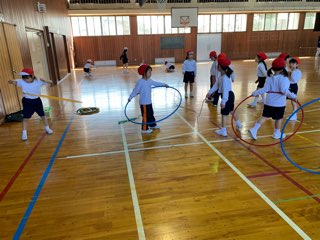 前にいる先生のマネ。子供たちのマネ。動物になりきって。