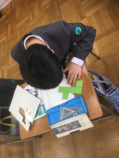 子どもたちは、ただ夢中になって正方形を組み合わせながら、立方体の展開図を見つけようとします。