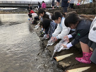 2019年1月25日 15時18分34名の子が、自分で約一か月間育てたヤマメを放流してきました。