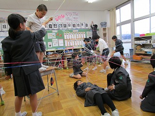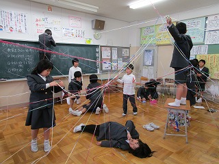 毛糸を使って、ひものつなぎ方や結び方、空間での張り方を工夫し、チームごとに