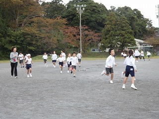 長休みに、全校児童が運動場に出て走ります。