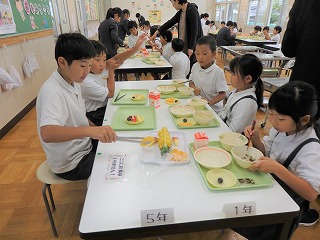 先週、1年生と5年1組がランチルームで一緒に給食を食べました。